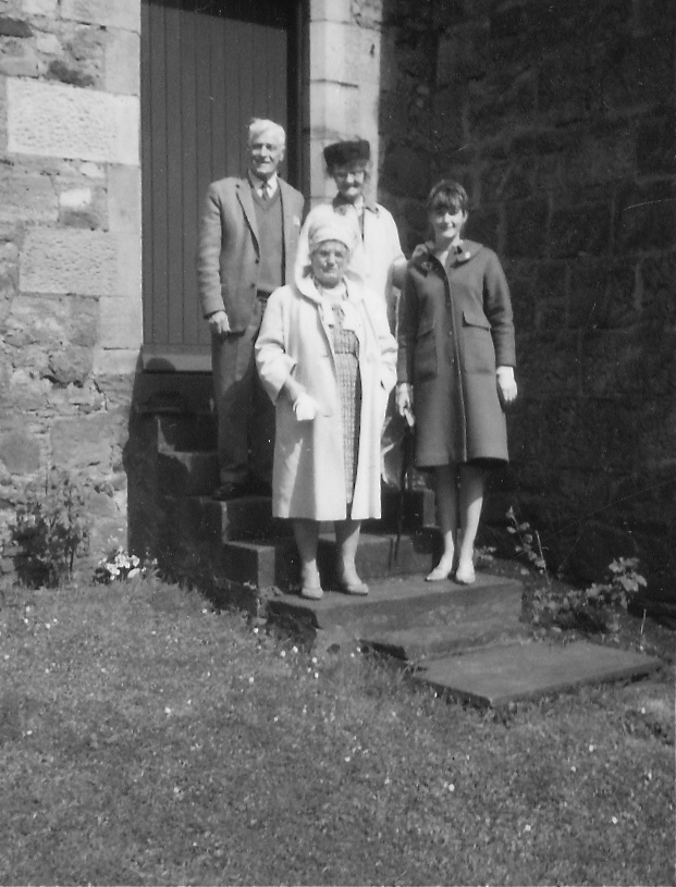 I’ve attached some photos: 1). Grampa & Grandma with Grampa’s sister from western Canada at the old house they grew up in. 2). Eric and I at the house. You can see the stonework matches the old photo. 3). Aunt Margaret…90, and as brightly dressed as ever. 4). Uncle Stewart…looking very well at 88. 5). Group including Milna and her future daughter-in-law. 6). My family: Myra, Robert, Allan’s wife Ann, Eric’s wife Margaret, Eric, myself and Allan.